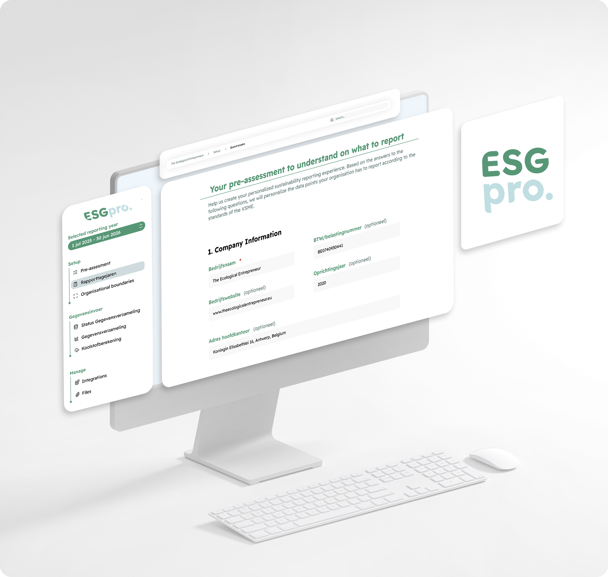 ESGpro is ontwikkeld door The Ecological Entrepreneur, specialisten in duurzaamheid op vlak van o.a duurzaamheidsstrategie, CO₂-analyse, LCA, sociale impact en rapportering. De expertise van consultants, vertaald in software die u zelf in handen houdt.